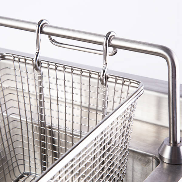 - Deze commerciële friteuse wordt geleverd met 2 frituurmandjes met een haak aan de voorkant en een hanger om uit te lekken, waardoor er minder voedselvet wordt gebruikt.