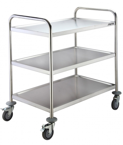- Materiaal: Edelstaal, - Zware uitvoering, - 3 schappen, max. draagvermogen circa 110 kg, - 4 Wielen ( 2 met remmen), - Levering in „flat-pack“ karton, makkelijk te monteren- Gew.: 16,5 kg, - Dim.: B 860 x T 540 x H 940 mm