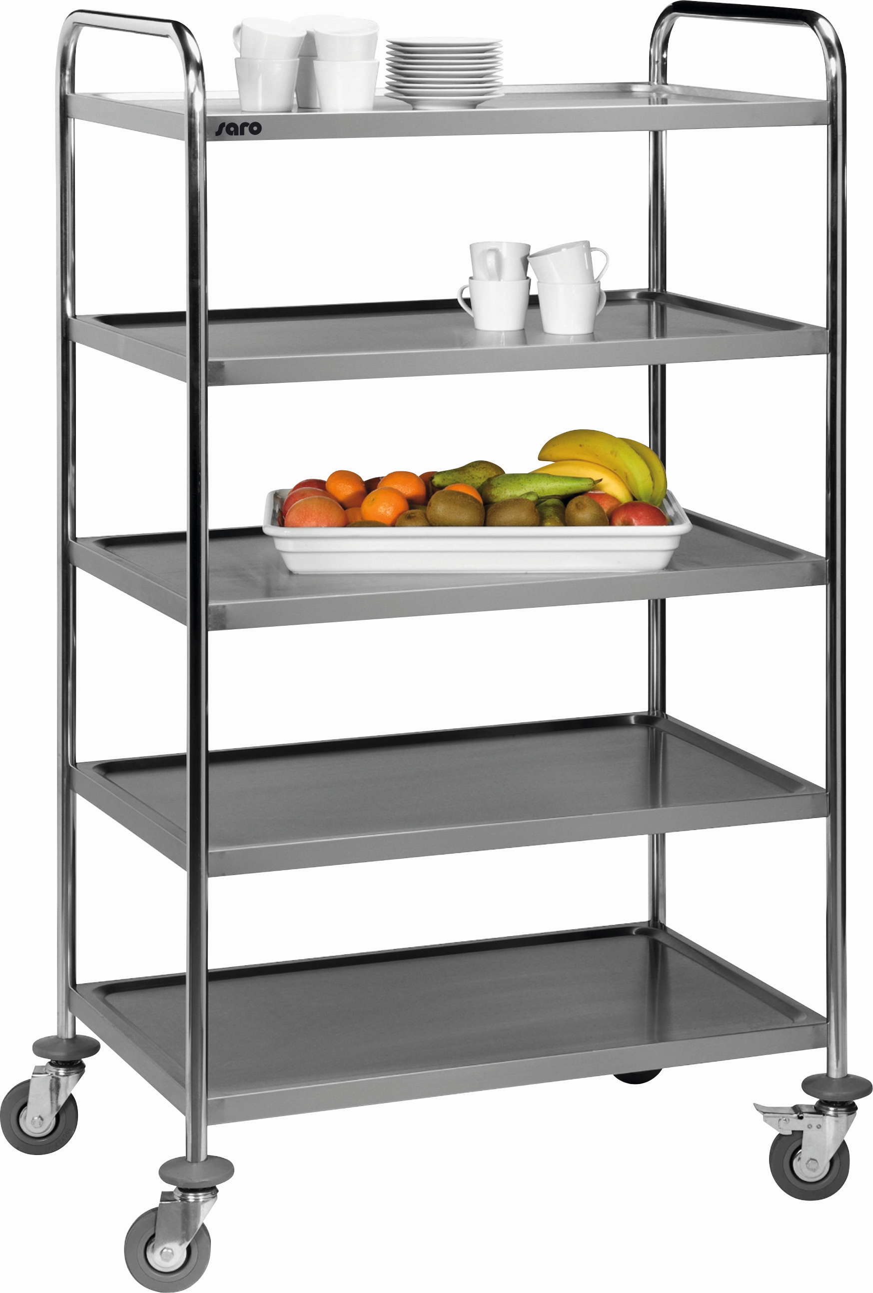 - Materiaal roestvrij staal, - Zeer stabiel, - 5 legplanken, max. belasting ca. 175 kg, - 4 soepel lopende wielen (2 met rem), - Levering in Flat-Pack-karton, eenvoudige montage.- Gew.: 23 kg, - Dim.: B 860 x T 540 x H 1540 mm