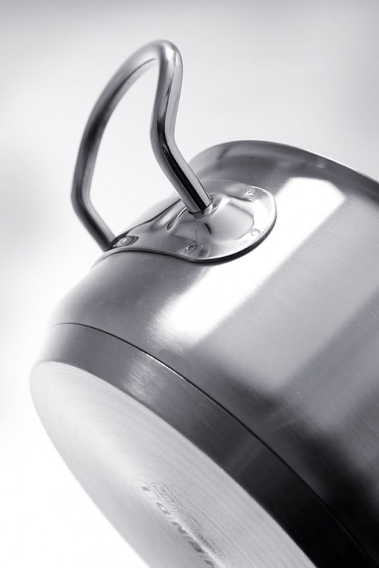 Gesloten sandwichbodem. Sandwich bodem (roestvast staal/aluminium/chroomstaal) combineert de hitte-eigenschappen van aluminium met de duurzaamheid van roestvast staal en de magnetische eigenschappen van chroomstaal die inductiekoken mogelijk maakt. Gesatineerde afwerking aan de buitenzijde. Stevige, op meerdere punten gelaste, koelblijvende handgrepen.