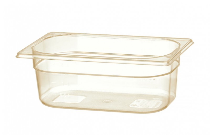 Gastronorm bakken gemaakt van Grilamid - hoogwaardige BPA-vrije polyamide. Hoge temperatuurbestendigheid van -40°C tot 150°C. Inzetbaar in elke fase van voedselbereiding: vriezers, shock koelers, magnetrons, bain-marie systemen en chafing dishes. Zeer stootvast en absorbeert geen geuren of smaken. Helder transparant met een lichte gele tint.