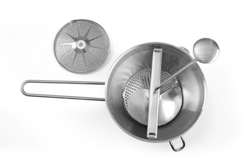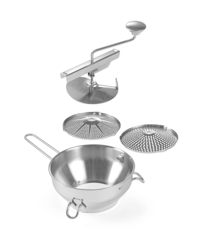 Zeer geschikt voor de bereiding van gebonden soep en tomatensaus. Inclusief 2 zeven (ø140 mm), grof en fijn.