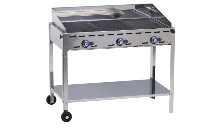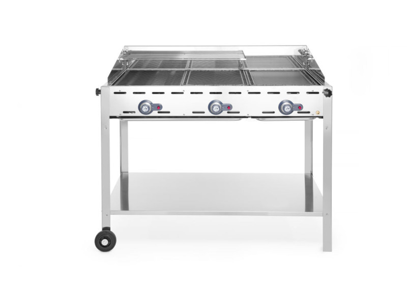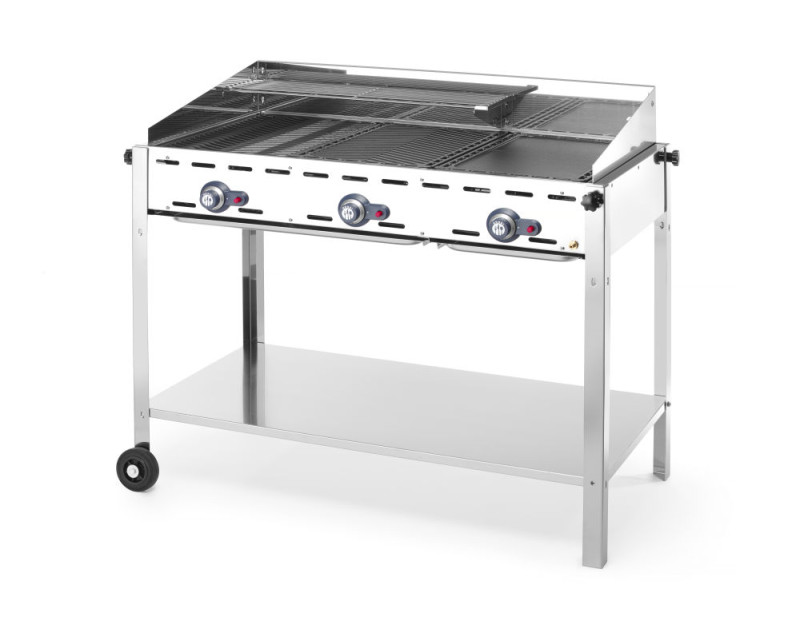 Inclusief geëmailleerde gietijzeren bakplaat en 2 grillroosters Gastronorm 1/1. Voorzien van windkap. Verhoogd roestvast stalen rooster voor het warmhouden van sauzen en gereed product. Gasslang aan te sluiten d.m.v. snelkoppeling. Slang en drukregelaar vast aan gasfles - verbeterde draagbaarheid.