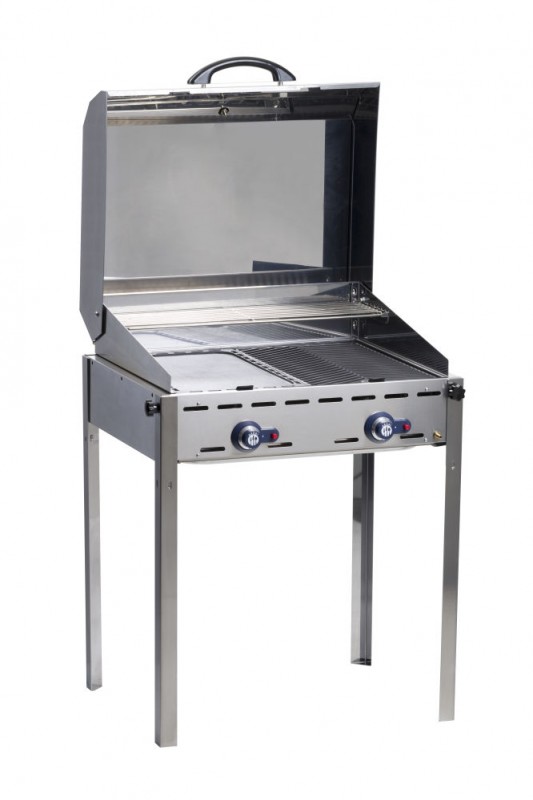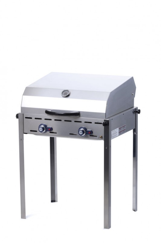 Voorzien van windkap. Verhoogd roestvast stalen rooster voor het warmhouden van sauzen en gereed product. Gasslang aan te sluiten d.m.v. snelkoppeling. Slang en drukregelaar vast aan gasfles - verbeterde draagbaarheid.