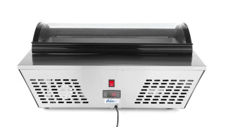 Behuizing van hoogwaardig roestvast staal, voorzien van gebogen glazen kap met gemakkelijk te openen systeem. Geforceerde luchtkoeling met automatische ontdooiing, compressor naast de koelruimte geplaatst. Geschikt voor 8x GN 1/6 GN-containers of 4x GN 1/3 containers (max. hoogte 100 mm), niet inbegrepen. Met 4 verstelbare roestvast stalen poten. Digitale temperatuurregelaar en display. Koelmiddel: R600a. Klimaatklasse: 4. Energielabel: C.