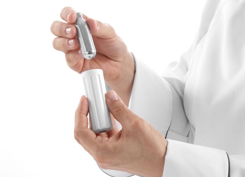 Aluminium kop, witte aluminium fles en patroonhouder. Met set van 3 polypropyleen spuitmondjes en schoonmaakborsteltje. Niet geschikt voor hete sauzen. Slagroompatronen (N₂O) vereist voor gebruik, niet inbegrepen.