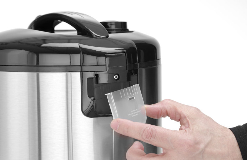 De behuizing is gemaakt van roestvast staal. Verwijderbare binnenpan gemaakt van aluminium met een anti-aanbaklaag, eenvoudig te reinigen. Het scharnierende polypropyleen deksel is voorzien van een handige handgreep, luchtdichte pakking en ontluchtingsklep. Het deksel sluit goed dankzij de geïntegreerde vergrendeling. De geïntegreerde condensatieopvangbak voorkomt dat de werkplek nat wordt. 2 modi - koken en warm houden; na het koken gaat het apparaat in de warmhoudmodus. Kan ook worden gebruikt om groenten te stomen met de meegeleverde stoommand. Capaciteit: 10 scheppen droge rijst (15-20 porties gekookte rijst). Inbegrepen: stoommand, rijstmaatbeker en lepel.