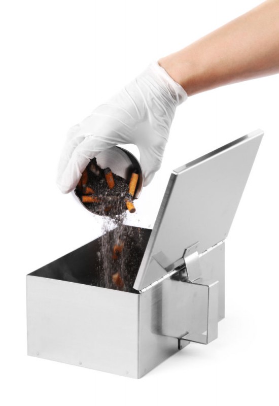 Met scharnierend deksel. Voor het brandveilig legen van asbakken.