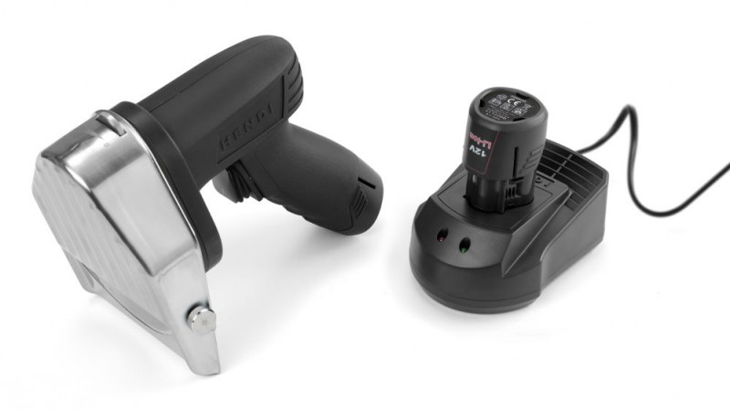 Voor het snijden van döner kebab, shoarma, gyros, etc. 2 roestvast stalen ø100 mm messen, 1 glad en 1 gekarteld. Het blad draait met 2600 tpm. Eenvoudig instelbare snijdikte van 0 mm tot 8 mm. Mes beschermer gemaakt van roestvast staal bevorderd veiligheid tijdens het snijden. Greep en behuizing van antislipmateriaal. AAN/UIT-schakelaar geïntegreerd met de behuizing. Twee batterijen met een capaciteit van ieder 2.000 mAh inbegrepen. Inclusief slijpsteen. Gewicht 1,3 kg.