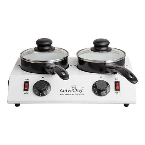 2 pans model, temperatuur instelbaar van 30-80°C en daardoor uitermate geschikt voor het smelten en/of verwarmen van chocolade of sauzen