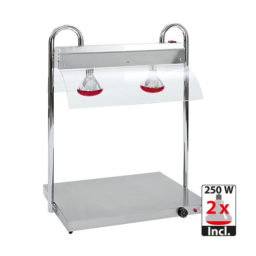 roestvrijstaal en verchroomde staanders, met apart inschakelbare verwarmde roestvrijstalen warmhoudplaat, thermostatisch instelbaar tot 90°C, compleet met hygiënische beschermkap van acrylglas en infra-roodlampen