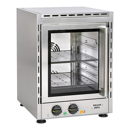 deze compacte heteluchtoven van Roller Grill is ideaal voor het bakken of opwarmen van brood, gebak, pizza's, maaltijden, enz. (bevroren, vers of voorgebakken), de temperatuur gaat in 12 minuten naar 270°C, met ventilatiegaten voor een perfecte luchtcirculatie, wordt compleet geleverd met 2 geperforeerde bakplaten (26x31 cm)