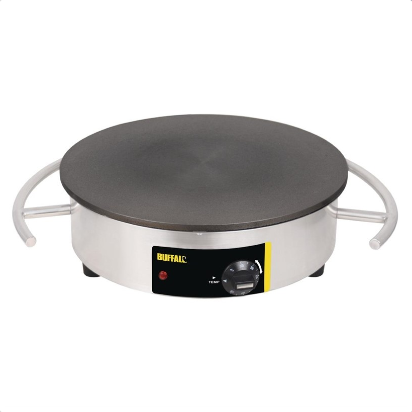Maak geweldige pannenkoeken en crêpes volgens traditionele methode met het RVS, elektrische crêpesapparaat van Buffalo.