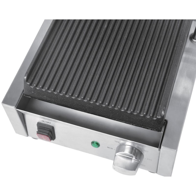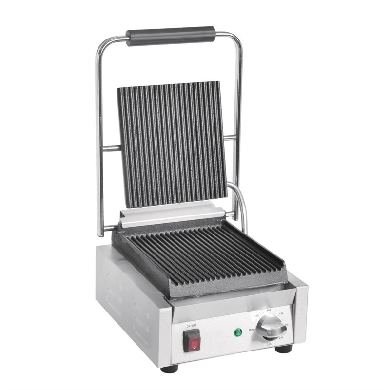 Vermogen: 1500W. Enkelvoudige grill. Gegroefde boven- en onderplaten