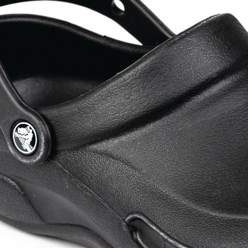 Speciaal ontwikkeld voor de horeca-industrie en getest volgens de norm ASTM F1677 voor slipweerstand. Overtreft de industriële standaards en is zelfs efficiënt op oppervlakken met water, zeep, olie en vet. Omsloten tenen en dikker middenvoetgebied zorgen voor extra voetbescherming tegen gemorste producten. De losse zit maakt een vrije en natuurlijke beweging van de voet mogelijk. Schokabsorberende werking minimaliseert de belasting van voeten, benen en rug. Eenvoudig te reinigen.
