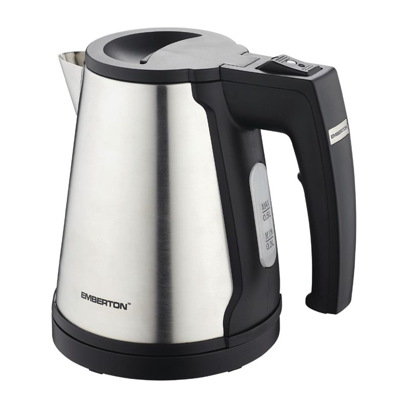 Draadloze RVS waterkoker. Inhoud 0,5 liter en voorzien van droogkookbeveiliging. Ideaal voor hotelkamers.