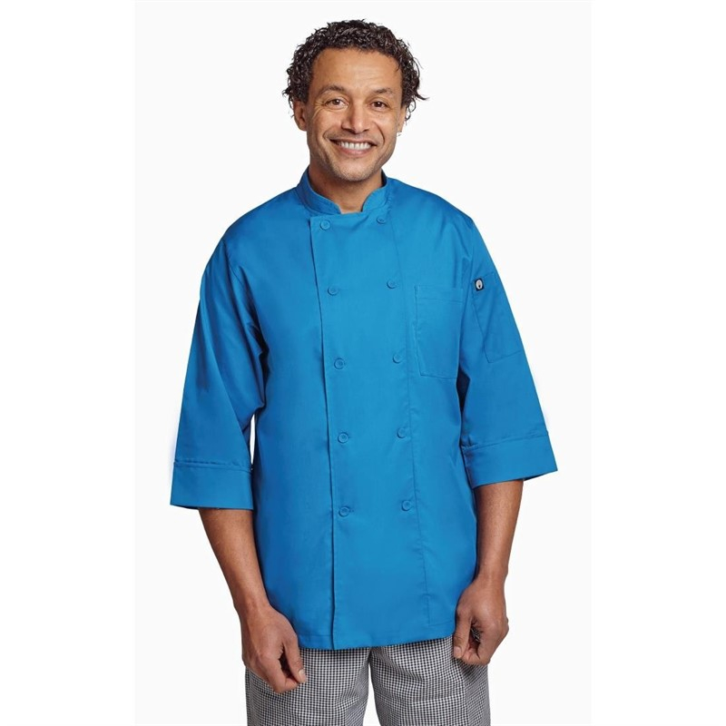 Breng kleur in uw keuken met deze helder gekleurde en praktische buizen met dubbele knoopsluiting, 3/4 mouwen en vervaardigd uit polyester/katoen. Voorzien van linkerborstzak en thermometerzak.