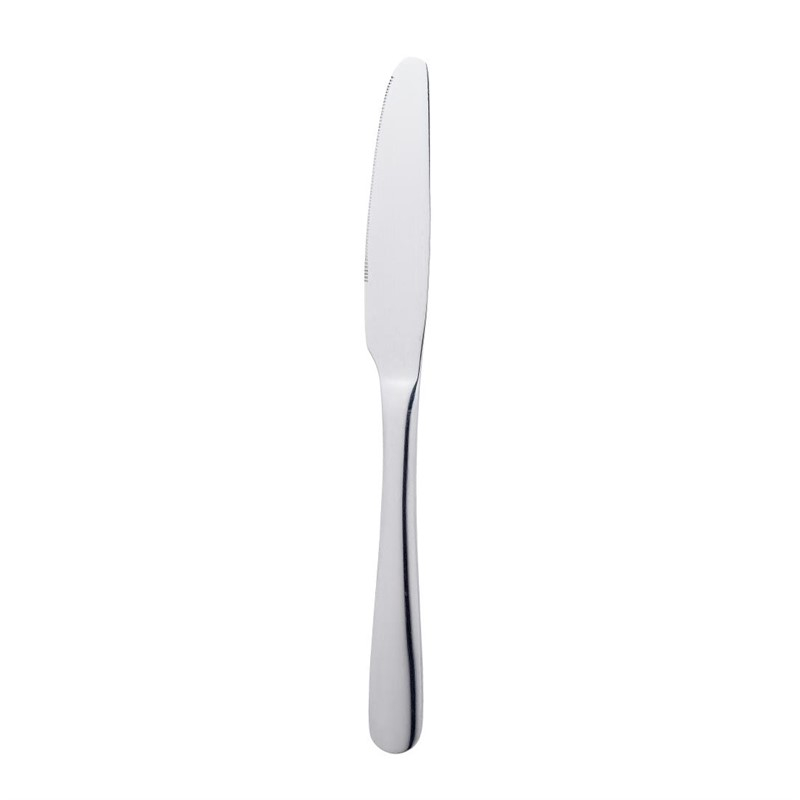 Sterk, gepolijst 18/0 RVS met afgeronde hoeken aan het einde van het heft. Prijs en verpakking per 12 stuks.