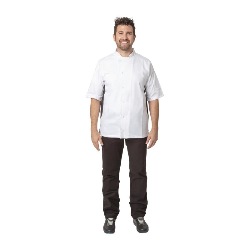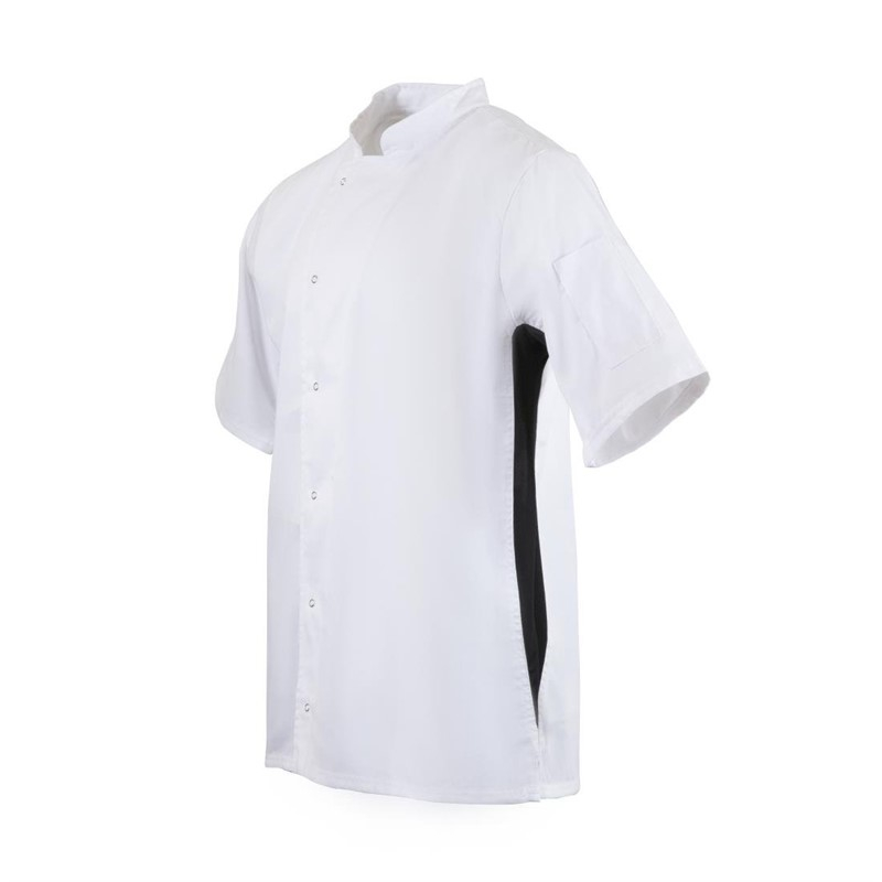 Lichtgewicht buis met korte mouwen en stijlvolle zwarte zijpanden. Voorzien van ventilerende panden voor een betere luchtcirculatie om je koel en droog te houden in drukke keukens.