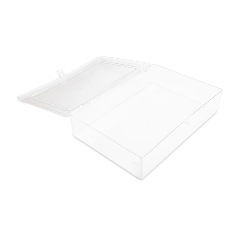 Stevige, stapelbare transparante bewaardoos voor bonbons, gemaakt van polystyreen. Met goed sluitende klip. Ideaal voor transport en opslag.