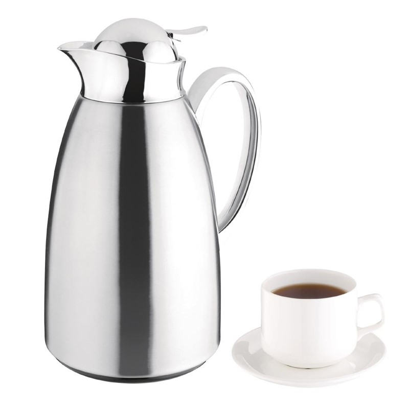 Verchroomde RVS thermoskan met glazen binnenkan. Om dranken warm of koud te houden. Met drukknop.