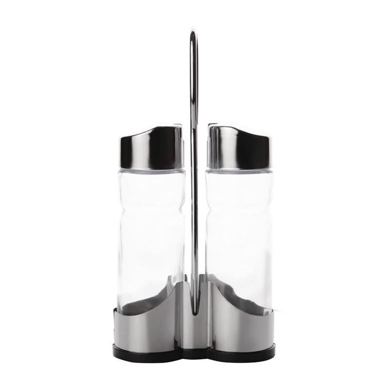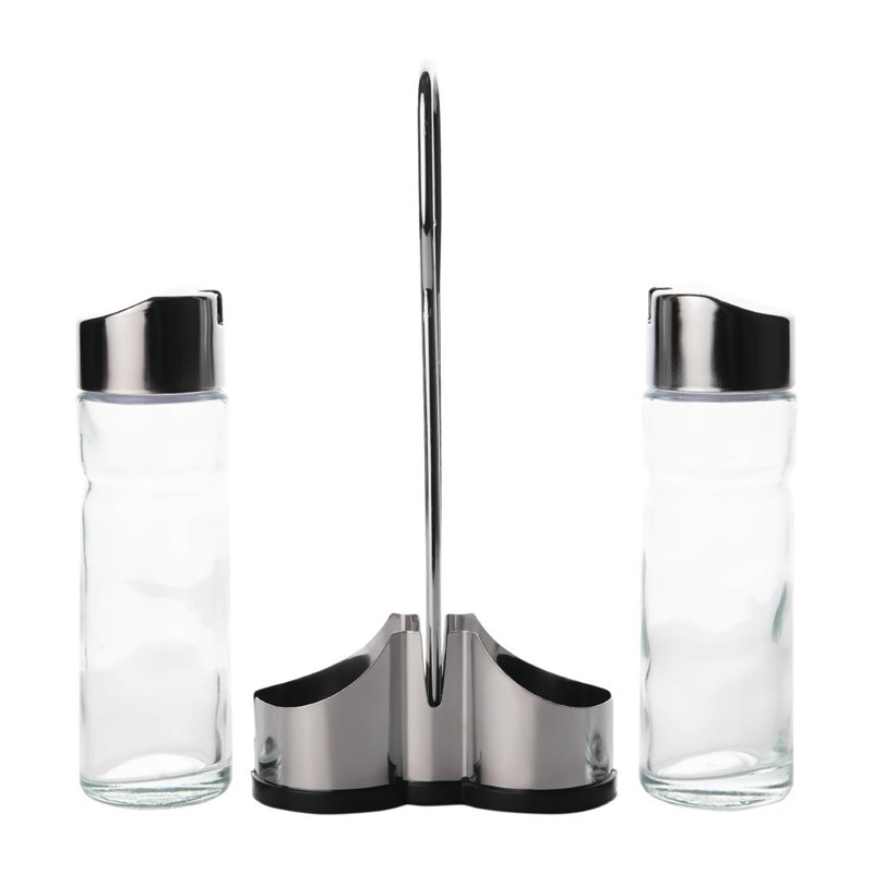 2-delige set met RVS houder en glazen olie- en azijnstel.