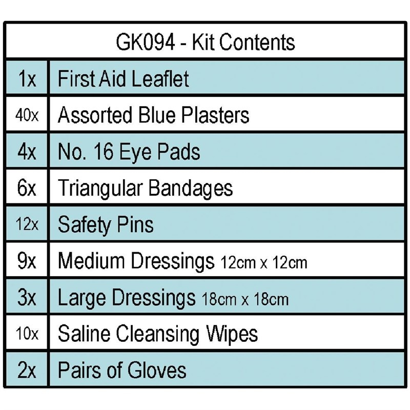 - Inhoud: eerste hulp folder, 40x blauwe pleisters assorti, 4x HSE oogverband, 6x driehoekig verband, 12x veiligheidsspelden, 9x medium 12x12cm steriel compres, 3x groot 18x18cm steriel compres, 10x steriele doekjes, 2x paar wegwerphandschoenen.