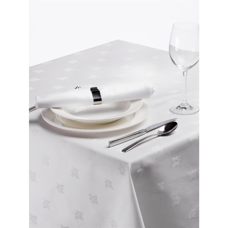 Duurzaam, fris wit tafellinnen met een elegant klimop motief voor een vleugje raffinement. Beschikbaar in diverse afmetingen. Bijpassende servetten beschikbaar voor de finishing touch.