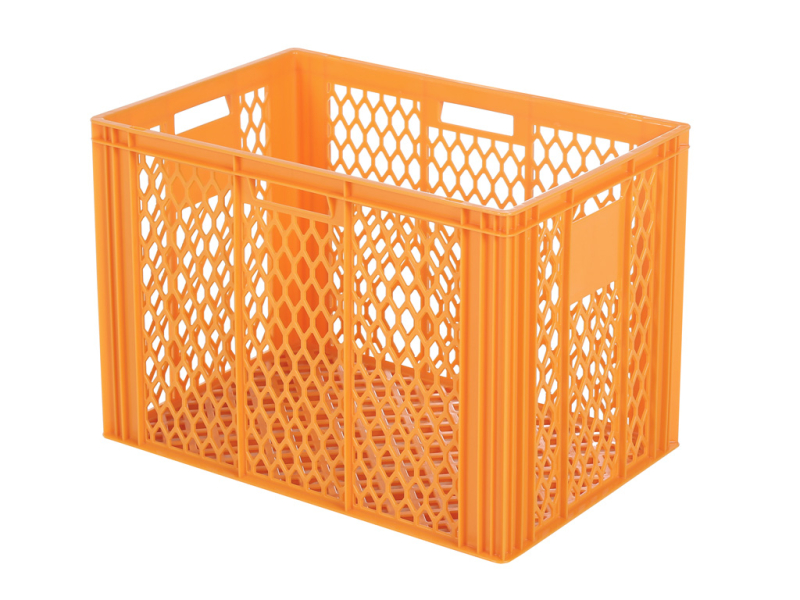 voedselveilige stapelbak/bakdoos met verstevigde bodem en geperforeerde zijwanden en 4 open handgrepen