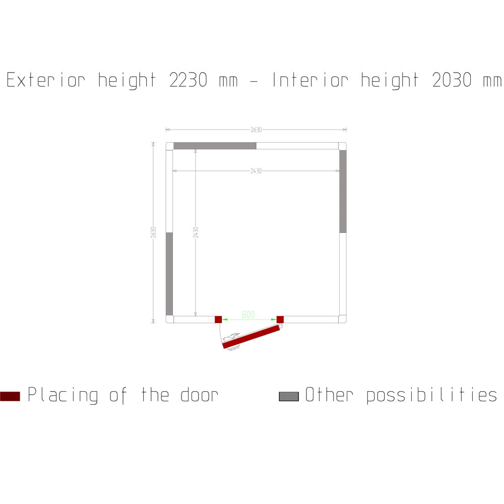 - Inwendige afmetingen 2430 x 2430 xh 2030 mm.