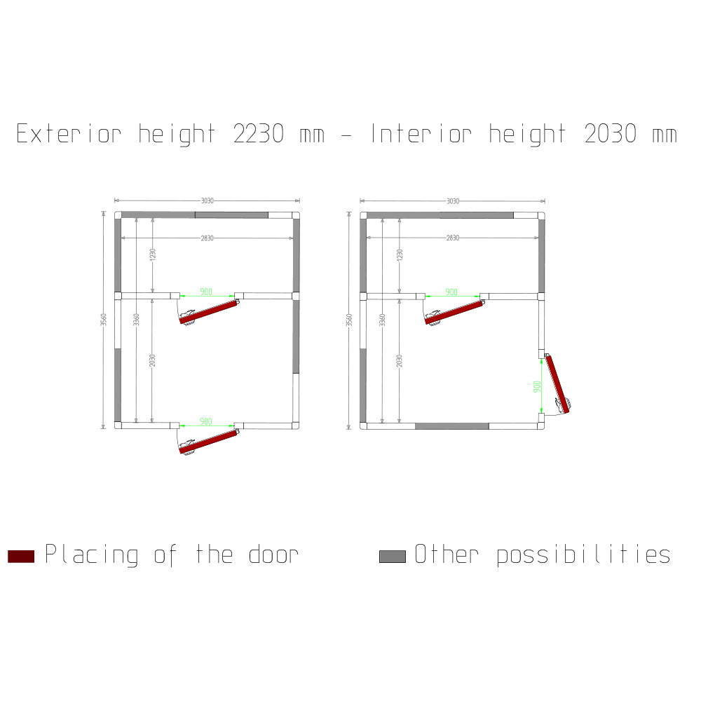 - Twee deuren met een nuttige doorgang van 900 x 1.900 mm (H) (de deur kan naar keuze op de drie zijden geplaatst worden).