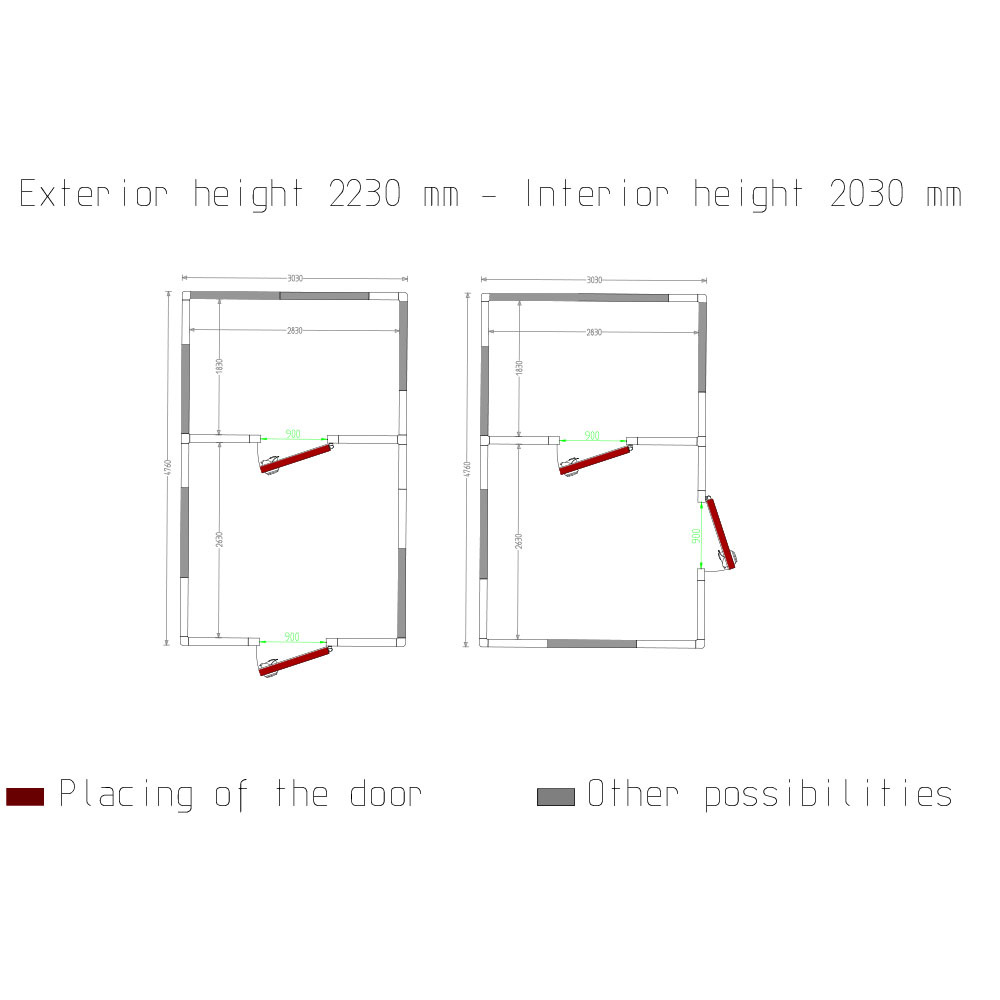 - Twee deuren met een nuttige doorgang van 900 x 1.900 mm (H) (de deur kan naar keuze op de drie zijden geplaatst worden).