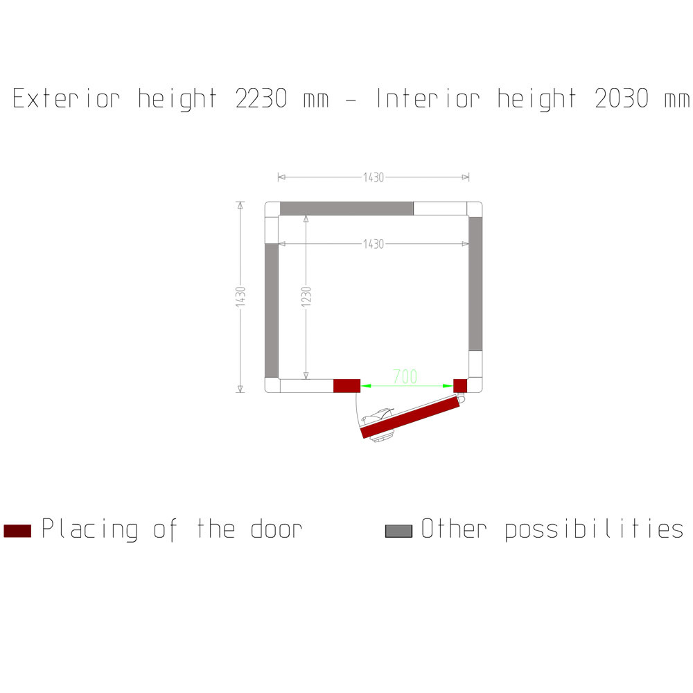 - Inwendige afmetingen 1430 x 1230 xh 2030 mm.