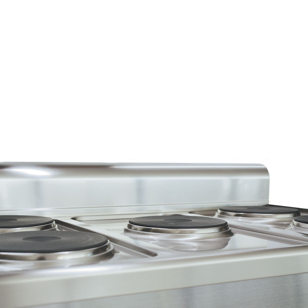 - Gietijzeren platen, Ø 180 mm met roestvrijstalen afdichtingsrand. Verwarmingsvermogenregeling door middel van een 6-standen schakelaar.