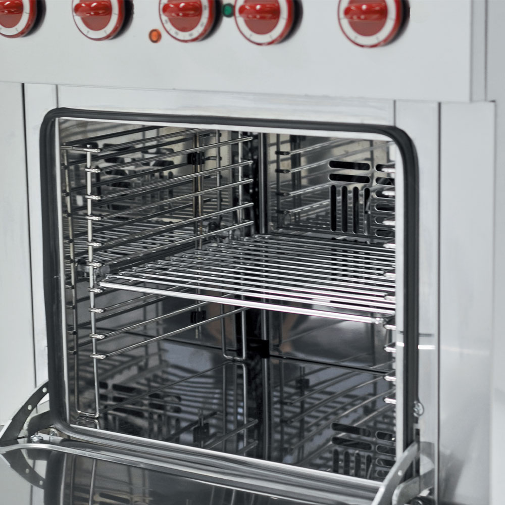 - De ovenbehuizing en de dubbelwandige deur zijn voorzien van thermische isolatie. Ovendeur op veerscharnieren, roestvrijstalen handgreep.