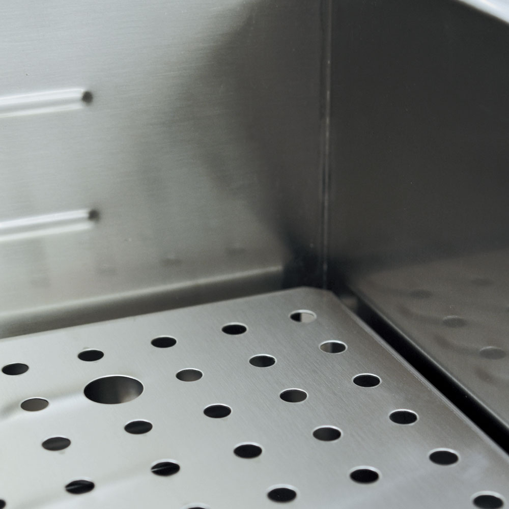 - Kuip in roestvrij staal AISI 304, standaard voorzien van een geperforeerd bodemrooster, een aftapkraan (kogelkraan) wordt aan de voorzijde van het apparaat geplaatst.