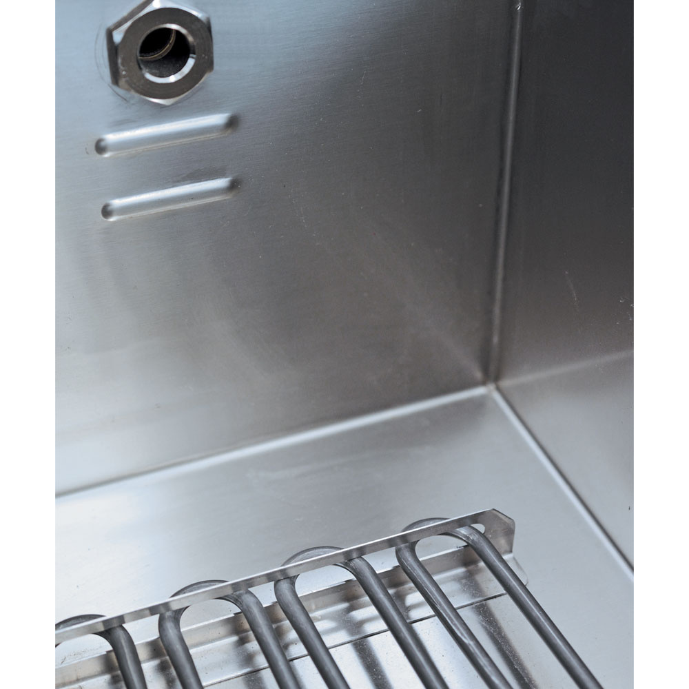 - Roestvrijstalen kuip van AISI 316, dikte 15/10e, bestand tegen zoutcorrosie en slijtage, met overloop voor zetmeel. De afvoerklep (kogelkraan) wordt op het frontpaneel van het toestel geplaatst. De binnenzijde van de kuip is voorzien van een dubbel geperforeerde bodem in roestvrij staal AISI 304 die de weerstanden beschermt tegen mogelijk contact met de manden.