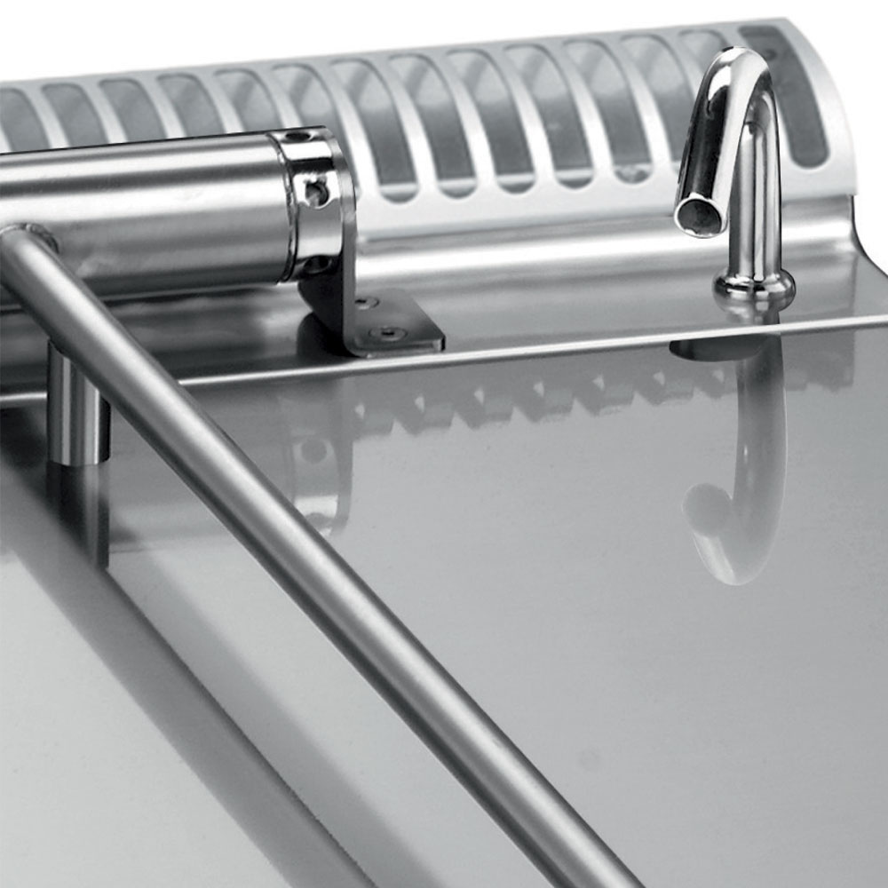 - Bovenste deksel van de kuip uitgerust op scharnieren met "spanveer" in roestvrij staal, voor een graduele opening en sluiting, voorzien van een ergonomische frontale handgreep.