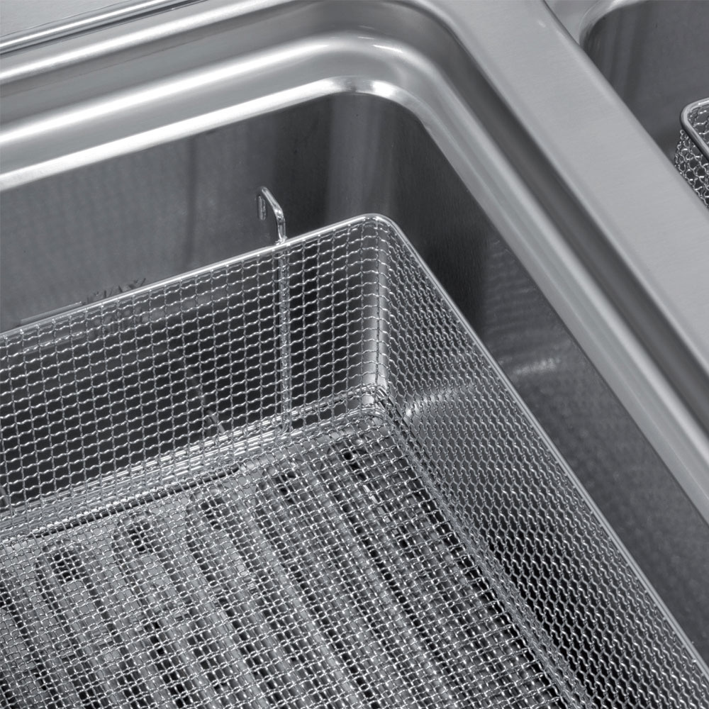 - "Diepgetrokken" kuip in roestvrij staal, afgeronde binnenhoeken, voorzien van koude zone, aftapkraan (kogel) geplaatst in de kast. Roestvrij stalen deksel. Opvangbak voor de olie, opgeslagen in de kast onderaan.