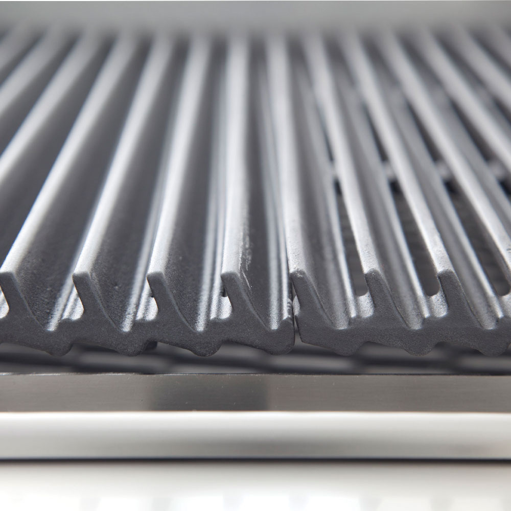 - Gietijzeren braadrooster, omkeerbaar (vlees/vis), voorzien van een anti-spat rand aan 3 zijden (3mm) in roestvrij staal.