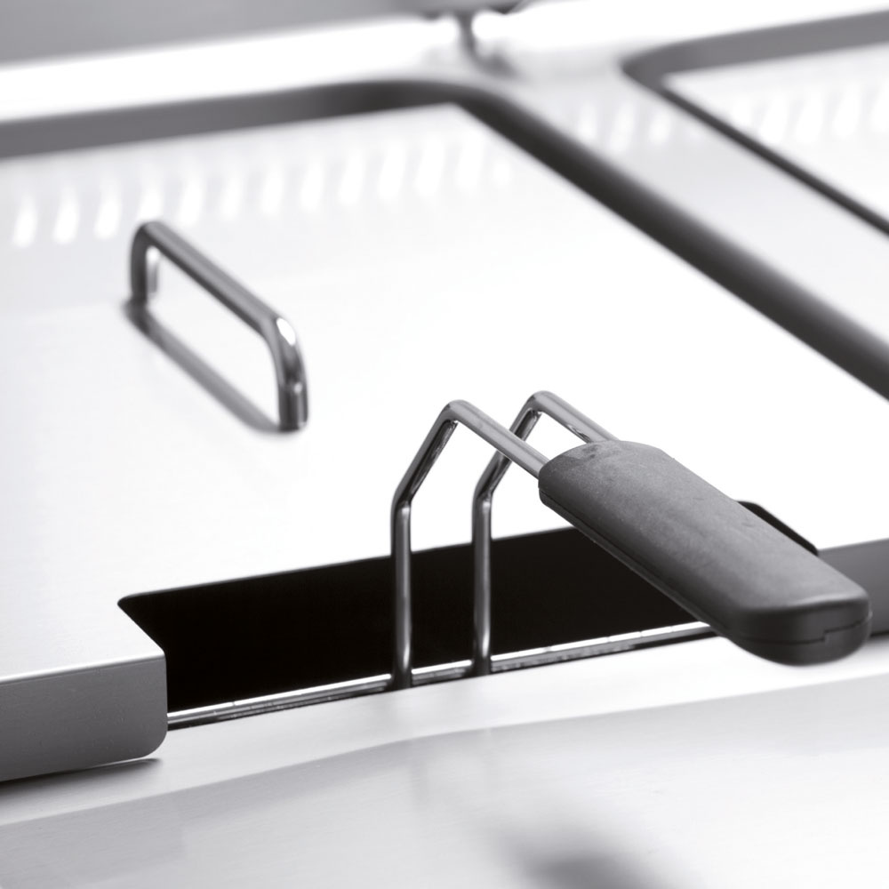- "Diepgetrokken" kuip in roestvrij staal, afgeronde binnenhoeken, voorzien van koude zone, aftapkraan (kogel) geplaatst in de kast. Roestvrij stalen deksel. Opvangbak voor de olie, opgeslagen in de kast onderaan.