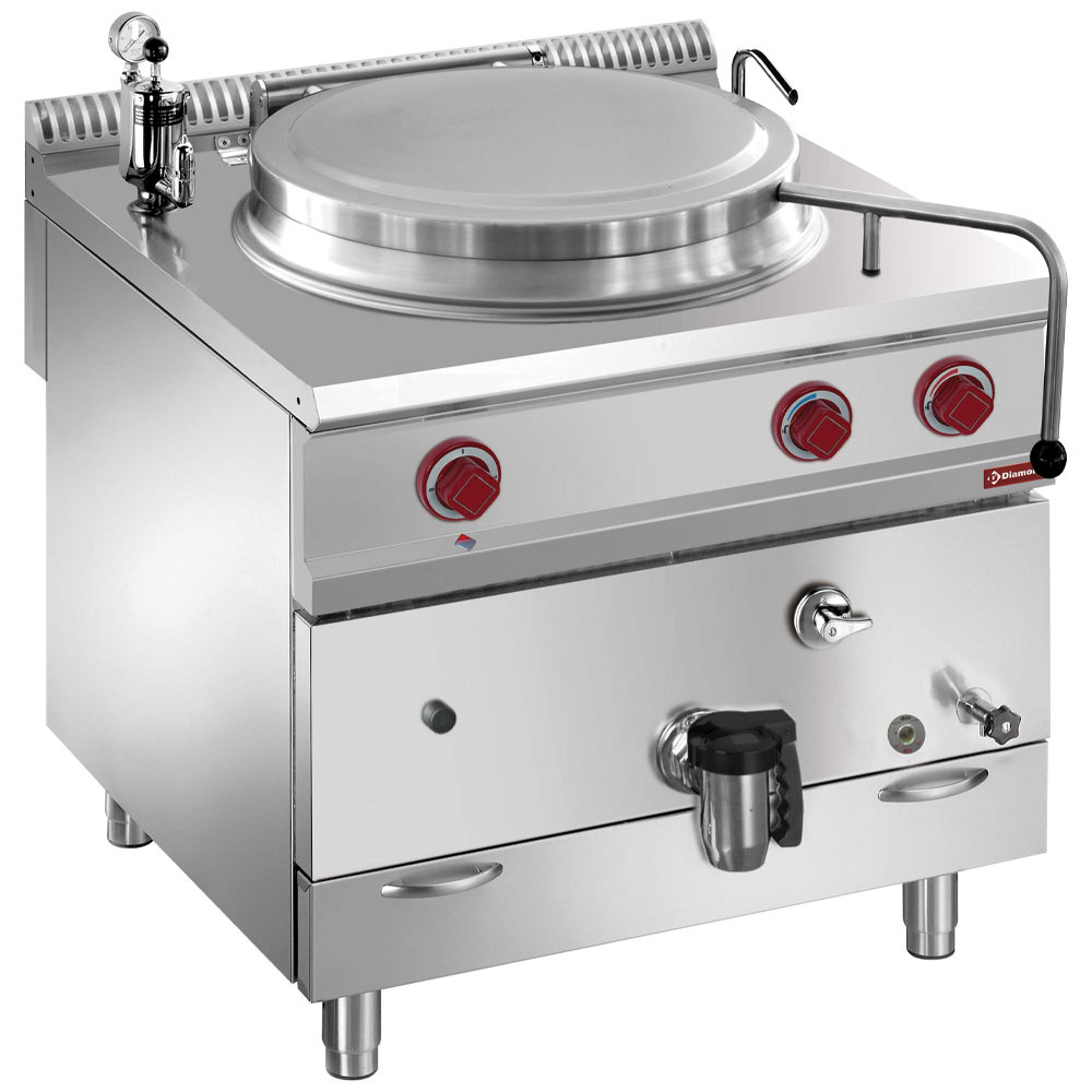 Uniform koken op een goede temperatuur dank zij de dubbelwandige kuip. Standaard met controletoezicht voor het waterpeil in de dubbele wand en demonteerbare afvoerkraan, smering en onderhoud zonder gereedschap. Met rond omlopende diepgetrokken TOP, ten einde vloeistoffen en condens op te vangen. Op aanvraag: dubbelwandig deksel.