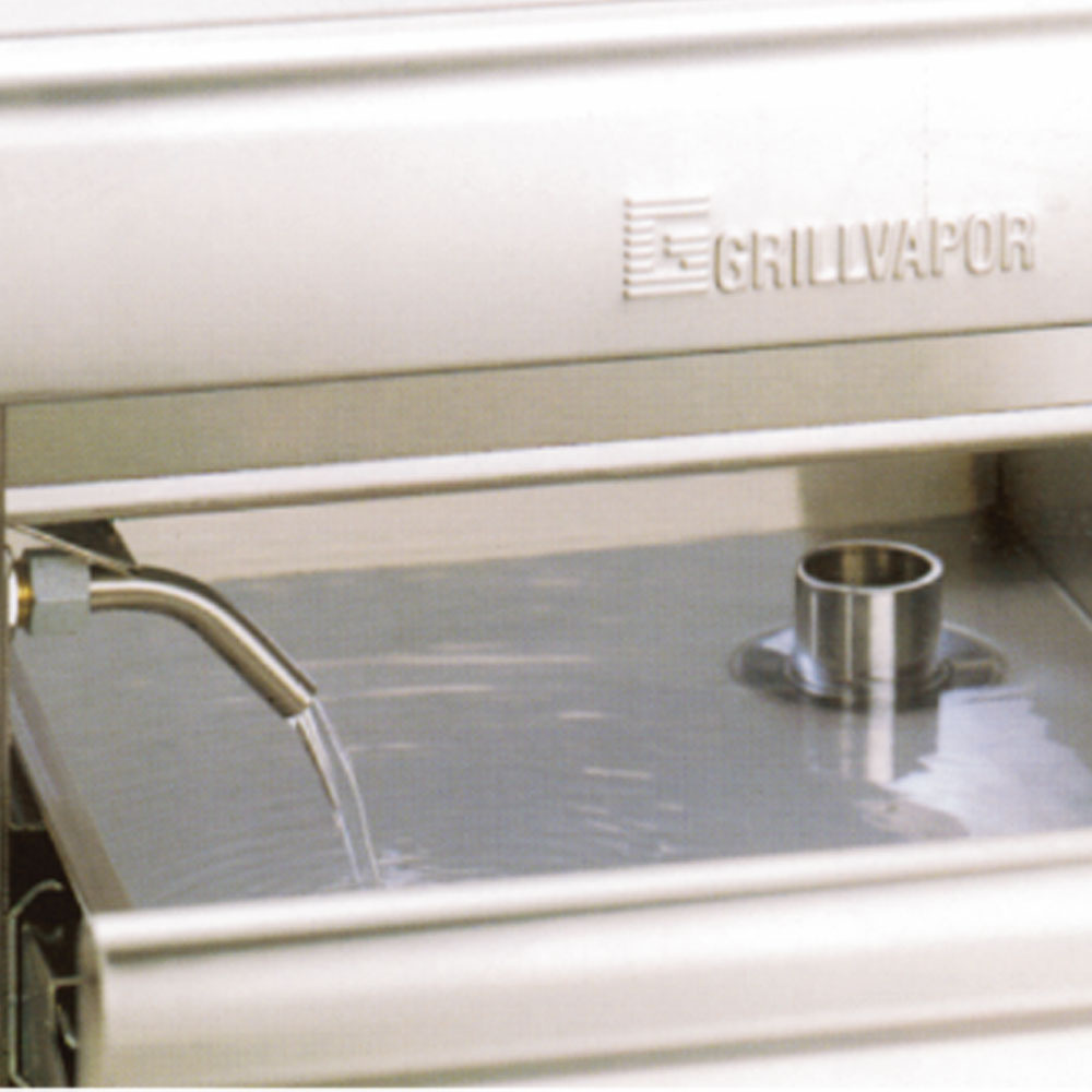 - De waterbak, die zich onder de grill bevindt, in R.V.S. met een direkte onderhoud van het netwerk, evenals een overlooppijp met dubbele functie nl. 1ste het kookvocht opvangen en de rook verdunnen vrij gemaakt door de voedingswaren , 2de een stoom vrijmaken die aanleiding geeft tot een beter kookresultaat.