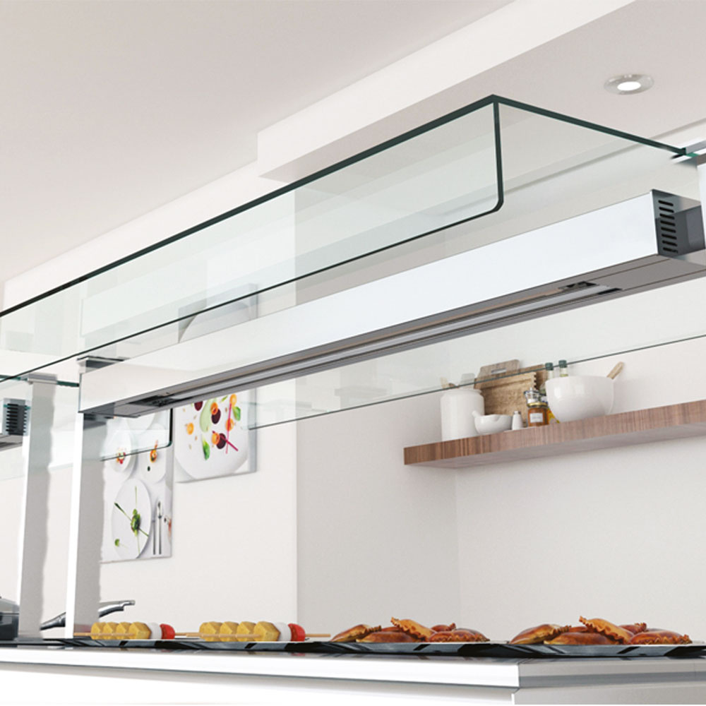 Bovenste schap gebogen bovenbouw "centraal eiland", in gehard glas.