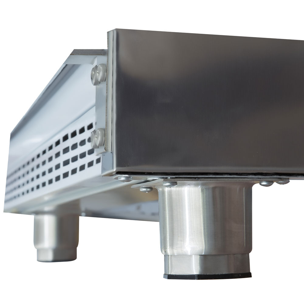 - Zwenkwielen aan de achterzijde en verstelbare poten aan de voorkant.