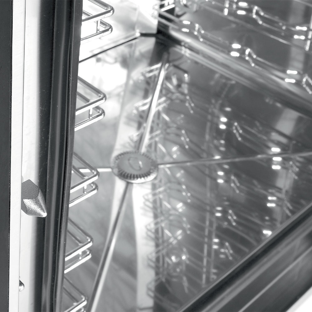 - Deur met dubbele beglazing (optie: deur met scharnieren aan rechterkant), glas aan binnenkant op scharnieren, Ergonomisch en thermisch handvat, automatische sluiting, dichtingsrubber (verwijderbaar).