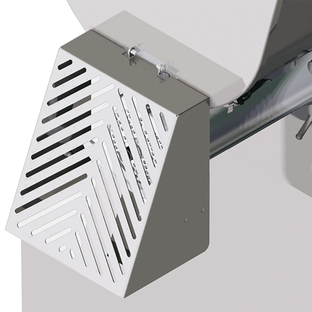 - Grote trechter bovenaan (563x900xh120) in R.V.S. AISI 304 (afneembaar), veiligheidsdispositief met micro-schakelaar, met vierkante toevoer voor een 2de zeer snelle doorgang.