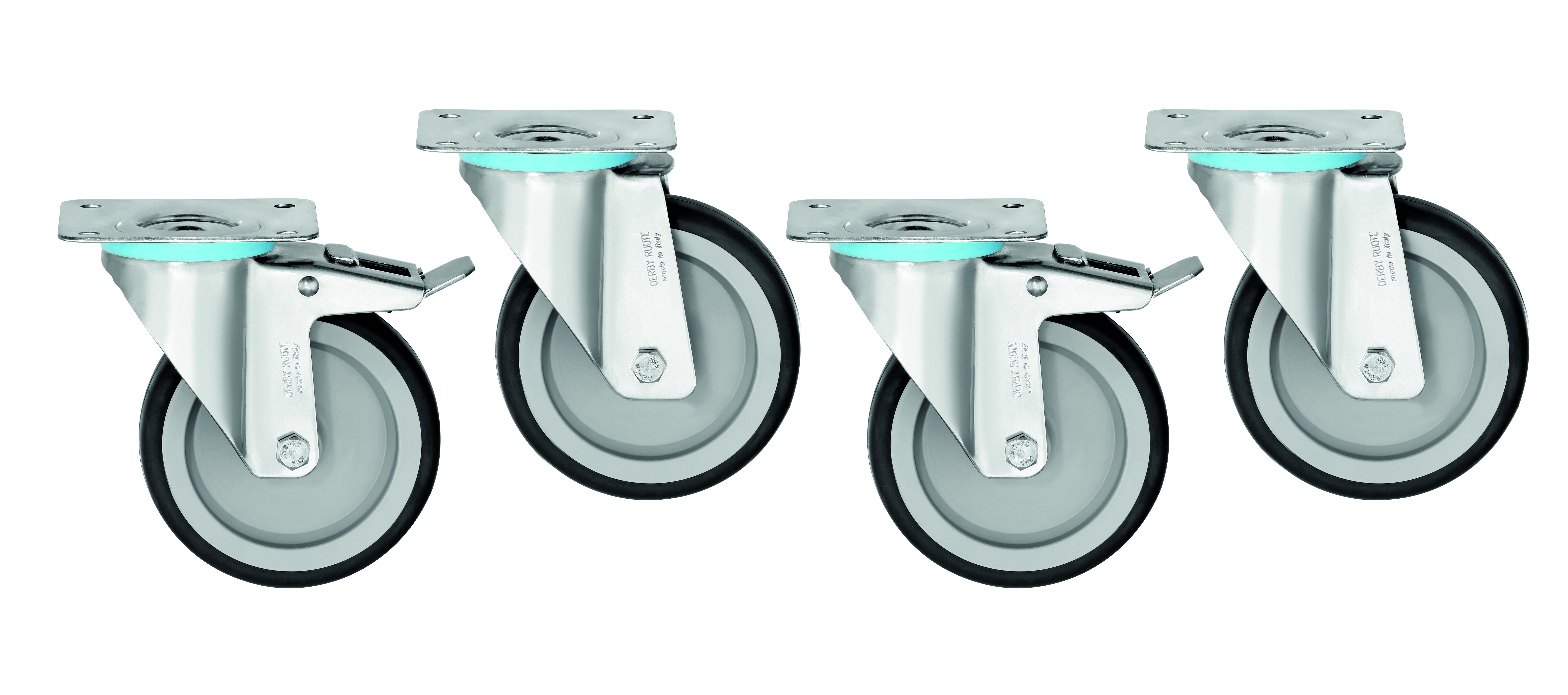 Zwenkwielen: 4 zwenkwielen, 2 met rem
