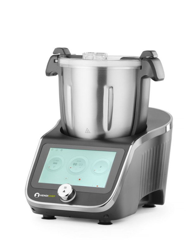 - wegen Extra functies: - weergeven van foto's van de ingrediënten van een bepaald gerecht - kleurendisplay van functies en parameters: TFT (Thin Film Transistor, dwz transistor gebruikt in liquid crystal displays) - creëren van het archief van gekookte gerechten - zoeken naar favoriete gerechten - nieuwe stappen creëren in de recepten HendiChef-constructie: - 4,5 liter multifunctionele pot (capaciteit 3 l) met een hoogvermogen verwarmingselement van hoogwaardig zuurbestendig roestvast staal (AISI 304-technologie) Transparante polycarbonaat deksel met een startsensor maakt controle over het proces mogelijk zonder het te openen 2 soorten deksels: HOT COVER voor de verwerking van warme voedingsmiddelen en COLD COVER voor de verwerking van koude voedingsmiddelen - messen met 4 messen gemaakt van gehard roestvast staal van klasse AISI 420 in een 3D-opstelling - Motorbehuizing - gemaakt van trillingsabsorberend materiaal; SLIDE LOCK-technologie voorkomt ongecontroleerde bewegingen op het aanrecht (materiaal behuizing - ABS) - stoom mand Accessoires: - Voedselroerder voor gekookte gerechten - Garde - onmisbaar bij het maken van emulsies zoals mayonaise, opkloppen van eiwitten of room - Geïntegreerde weegschaal (kwarts) van 5 g tot 5 kg met tarrafunctie. 5 JAAR GARANTIE Overige accessoires: - Siliconen spatel bestand tegen slijtage en temperatuur - Maatbeker voor nauwkeurige dosering De accessoires zijn vaatwasmachinebestendig Technische parameters: • Temperatuurregeling van 37 ° C tot 130 ° C • Timer: 0-90 min • 12 roerder snelheidsinstellingen • 2 USB-slots om recepten te uploaden (aan de onderkant van de machine) • Afmetingen: 210 x 380 x (H) 320 mm • Inhoud kom: 4,5 l • Totale stroomvoorziening: 1400 W • Frequentie: 50 Hz • Spanning: 230 V • Netto / brutogewicht: 17,2 kg / 18,2 kg
