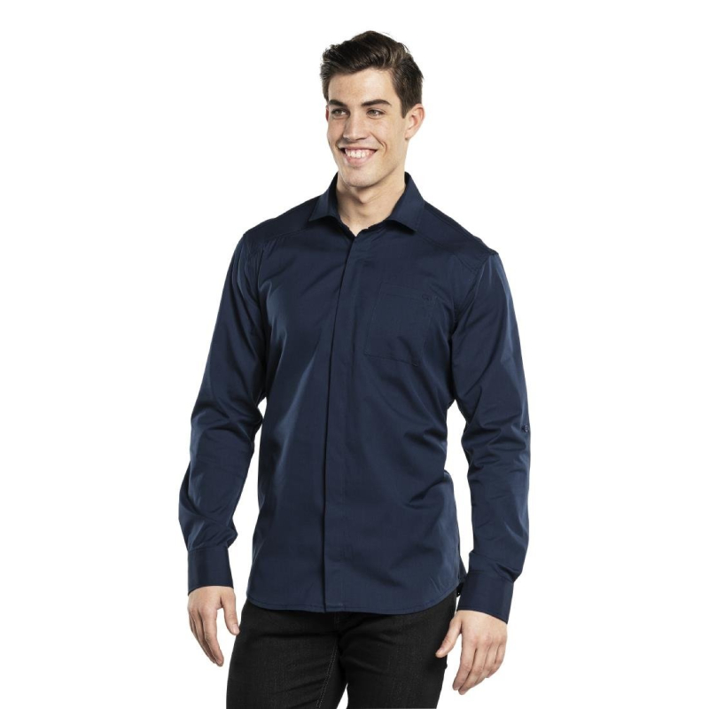 Een zachte, kreukvrije stof met een comfortabele pasvorm maakt deze serviceblouse prettig om in te werken. De jersey rugpanden houden het shirt luchtig en comfortabel, terwijl de glad geweven stof kwaliteit uitstraalt. Dit donkerblauwe herenoverhemd heeft een verborgen knoopsluiting en is gemakkelijk te combineren met onze schorten en tailleschorten.